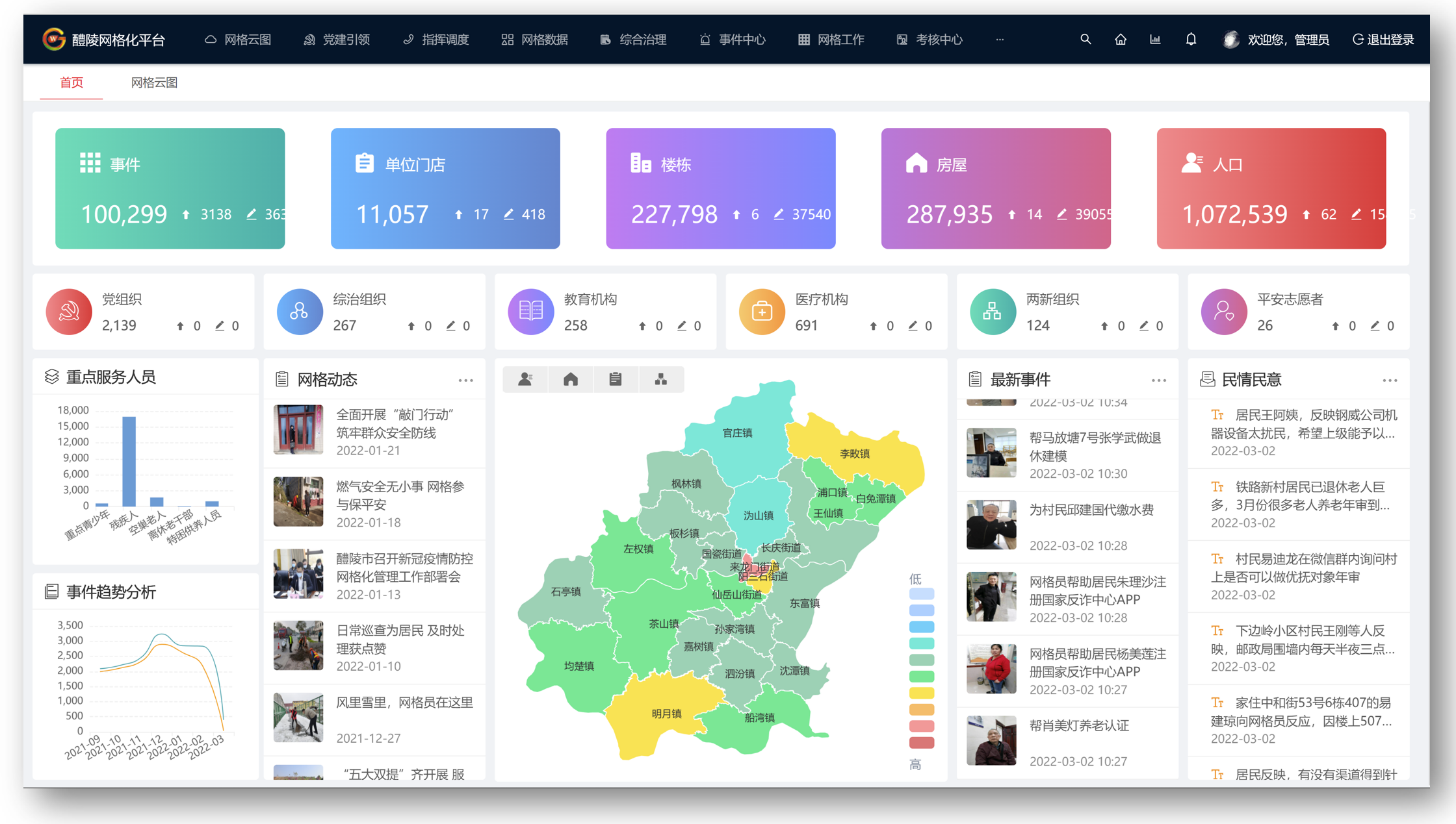 響應十四五規(guī)劃基層治理工作全面下沉的工作號召,建設以黨建為引領、提升基層治理水平為核心、 服務百姓為補充的網(wǎng)格化管理平臺,幫助社區(qū)更好的實現(xiàn)精細化治理。管理者、網(wǎng)格員、群眾老百姓,三方聯(lián)動、三方考慮、三方便捷。物聯(lián)融合助理研判分析。通過對接物聯(lián)網(wǎng)設備,并運用相關算法進行分析,提升精細化治理水平。